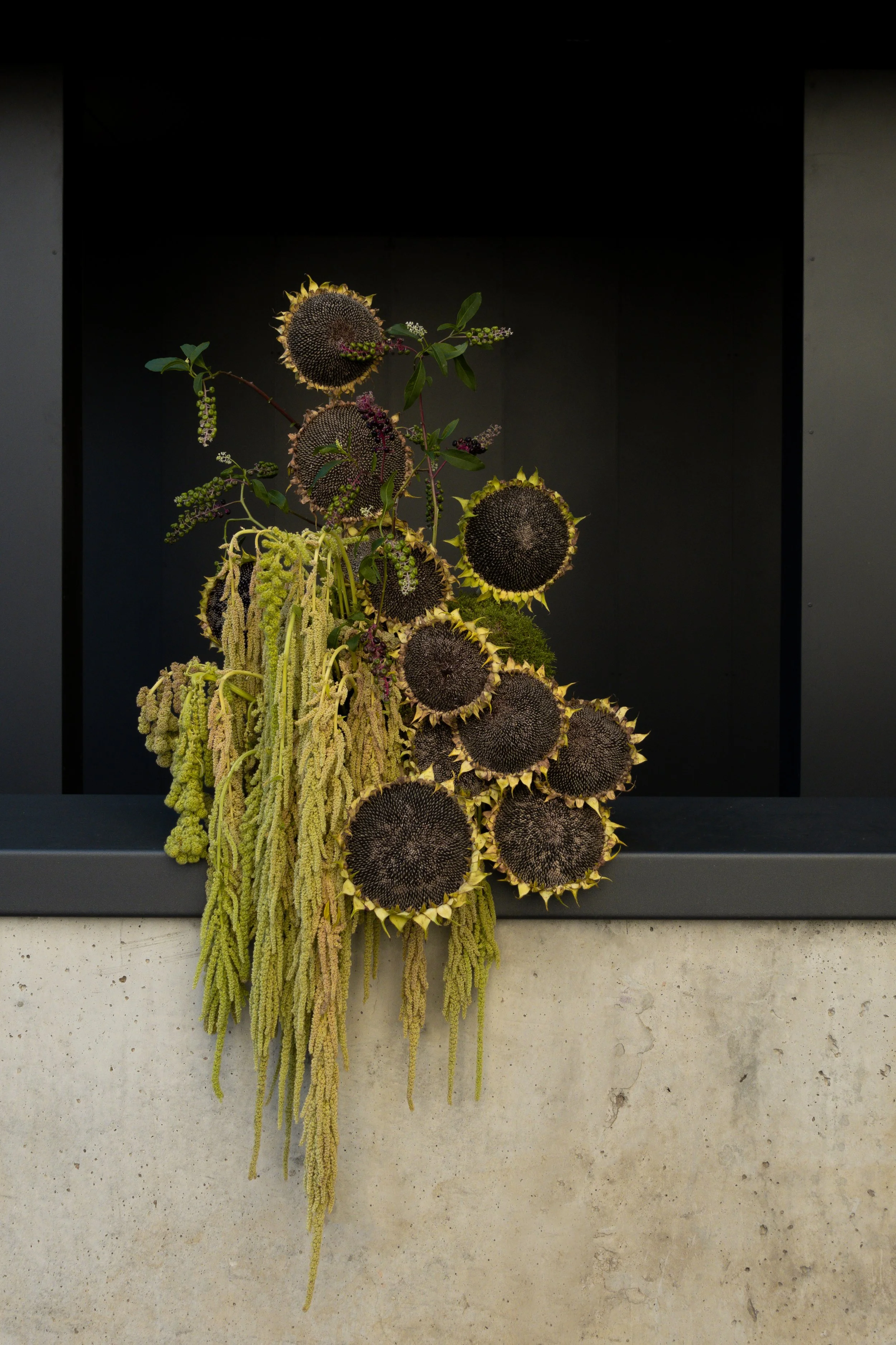 A dynamic floral installation featuring an abundant arrangement of sunflowers, delicate blooms, and fresh hanging greenery designed to celebrate the new ASICS Gel-NYC release in collaboration with Kicki Yang Zhang. The composition combines sunflower heads with soft pink florals, complemented by hanging amaranthus that creates natural draping effects. Each botanical element is carefully selected and positioned to enhance the overall aesthetic, with the varied textures and organic forms creating visual movement and depth. The installation's rich interplay of colors and textures reflects the innovative design language of the collaboration.