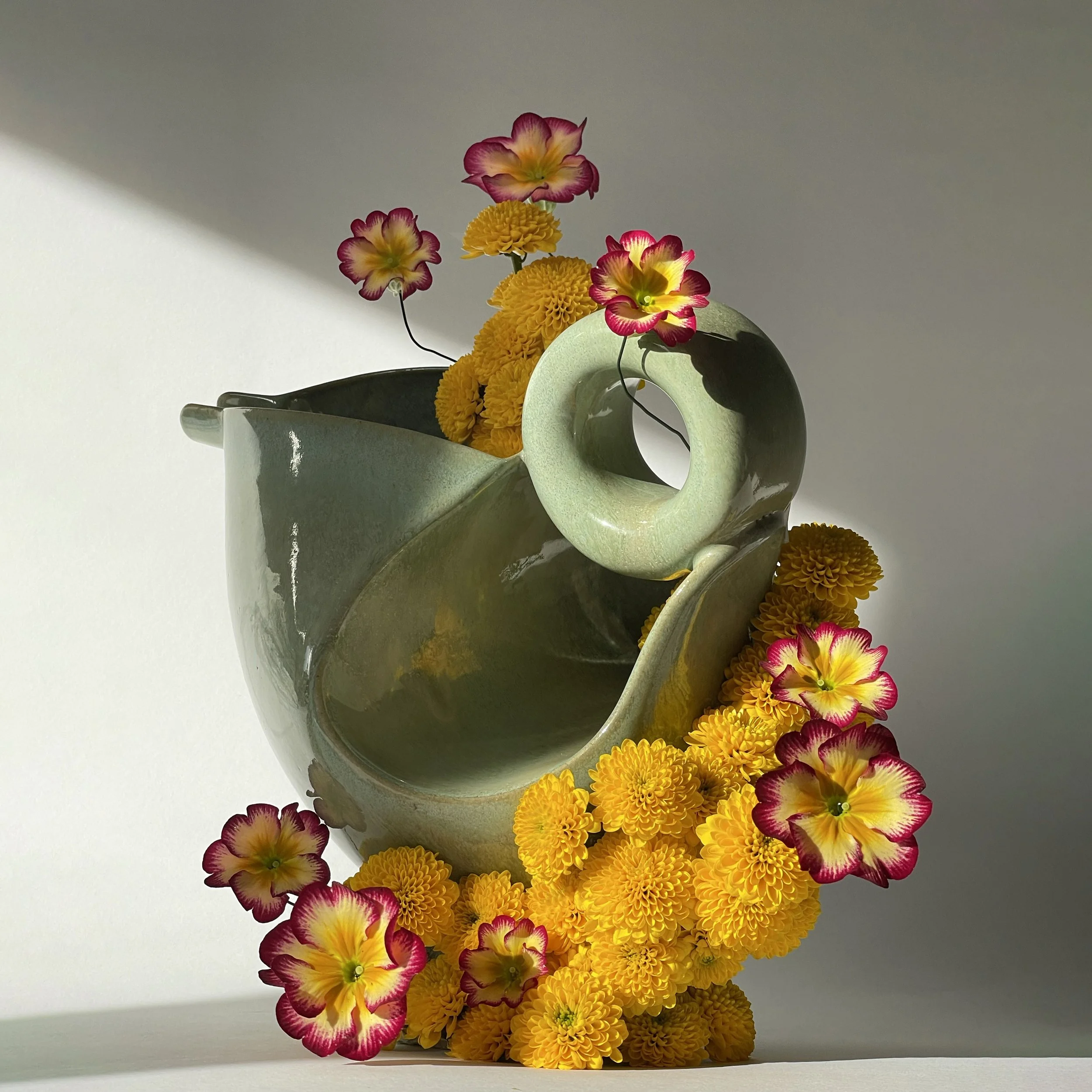 A playful floral installation featuring Jeremy Bellina's distinctive bird jug appears to float weightlessly within a billowing cloud of chrysanthemums. Delicate primula blooms drift and dance around the ceramic vessel like butterflies in flight, their ethereal presence creating an enchanting sense of levitation—as if these gossamer petals might lift the jug skyward at any moment.