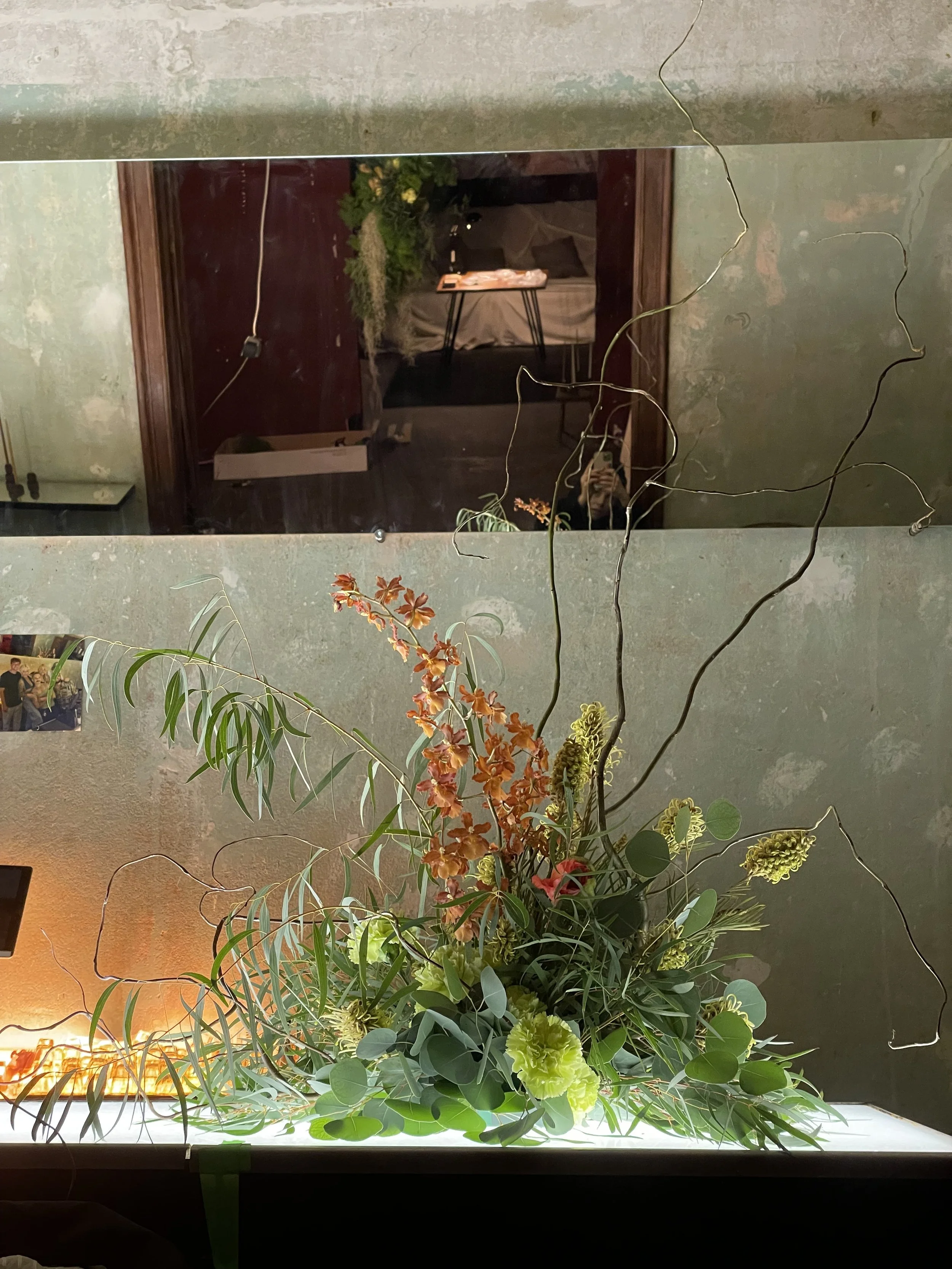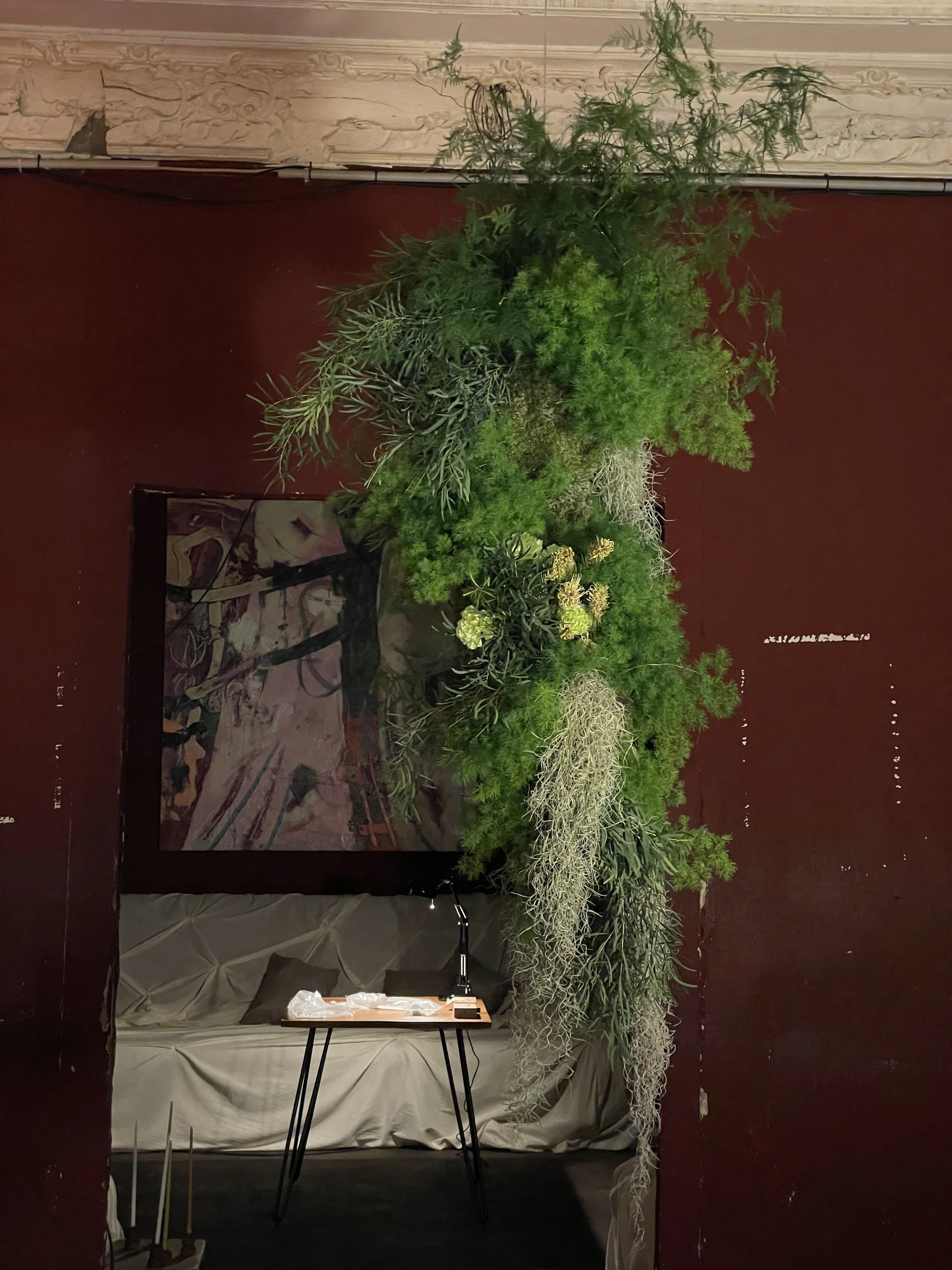 A vertical installation suspended grom above the dance floor, serving as an interactive focal point for guests. The design featured fresh eucalyptus complemented by diverse greenery to create varied textures and visual interest.
