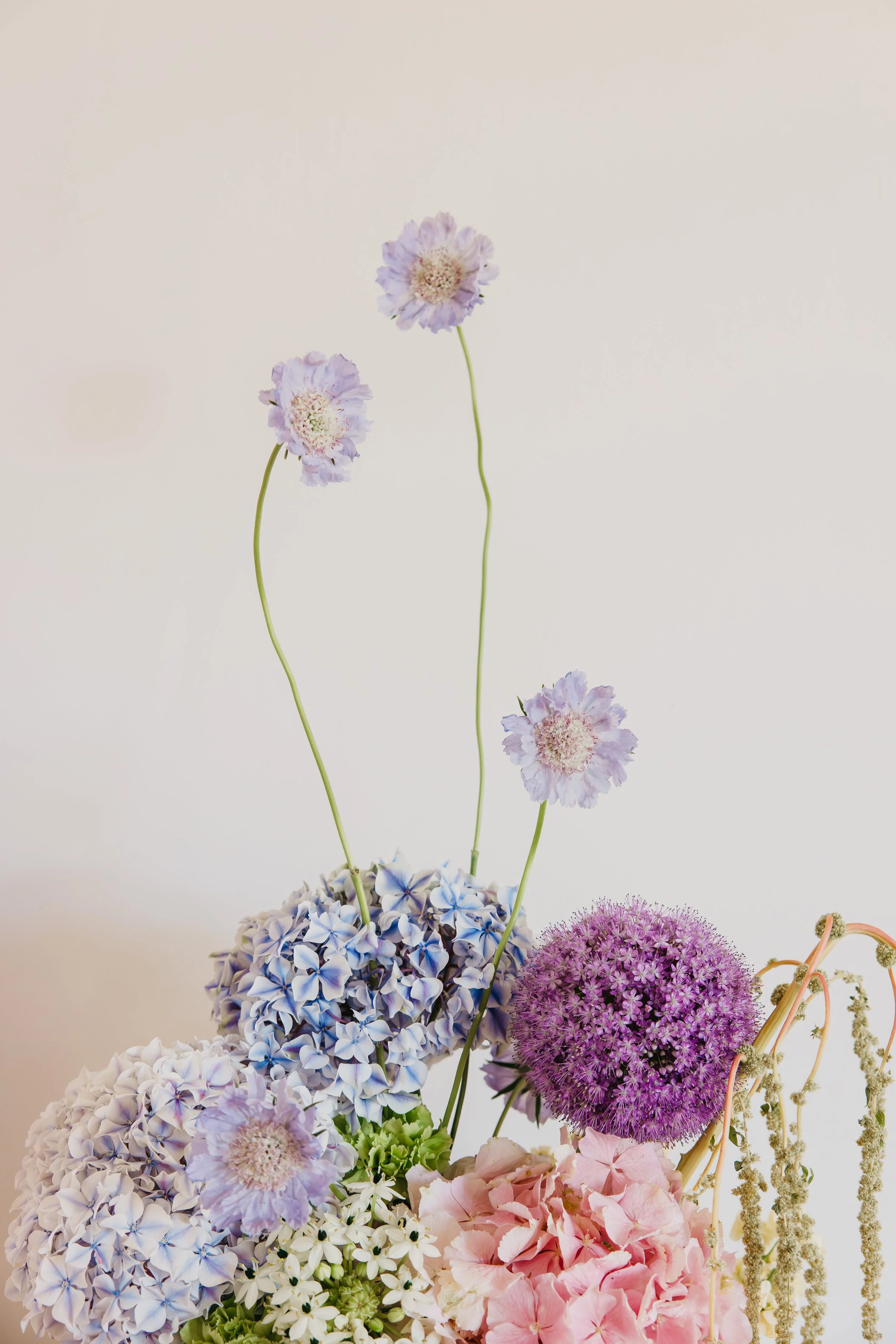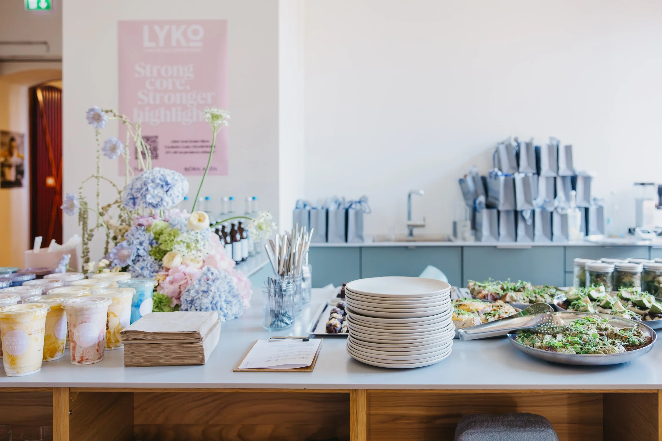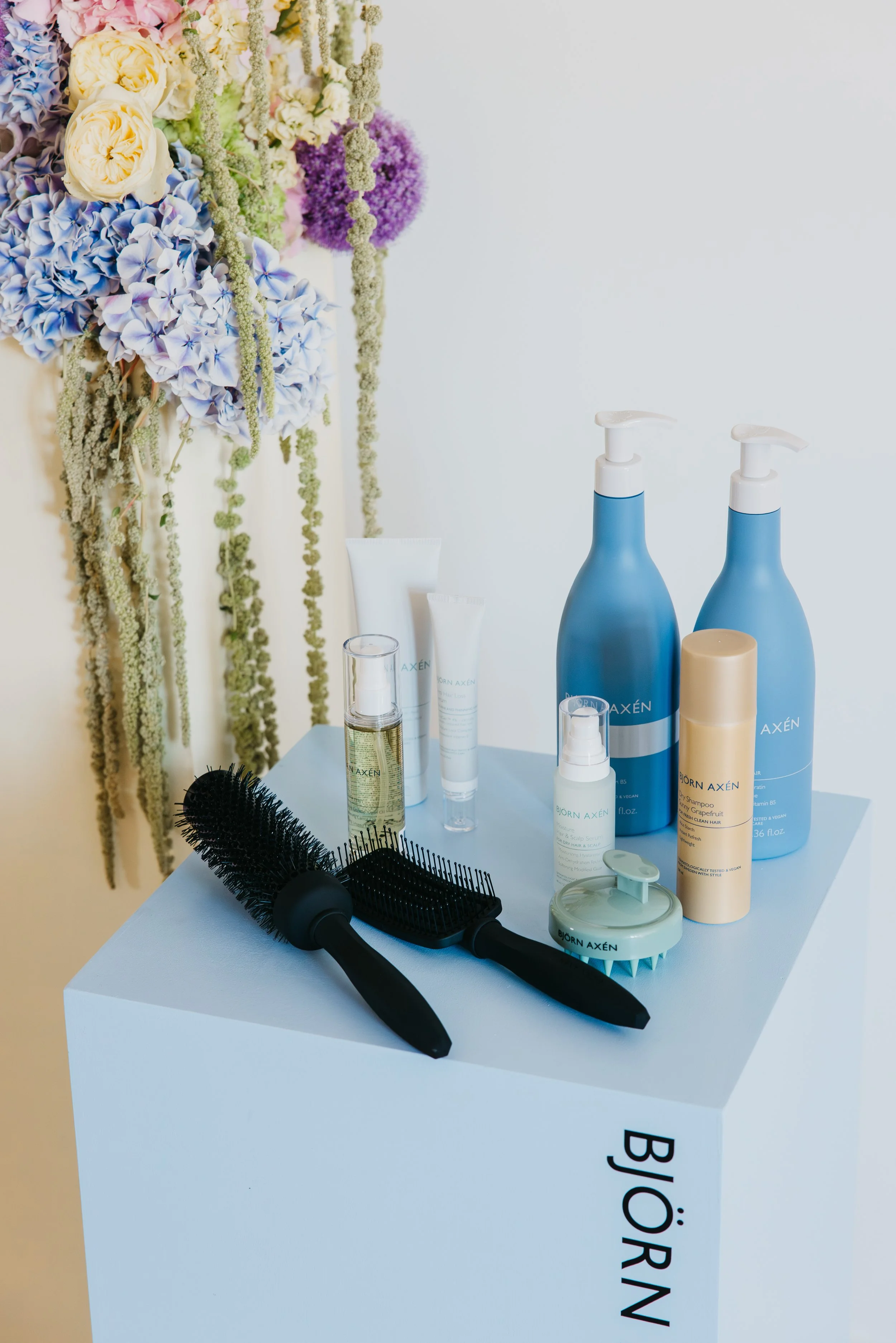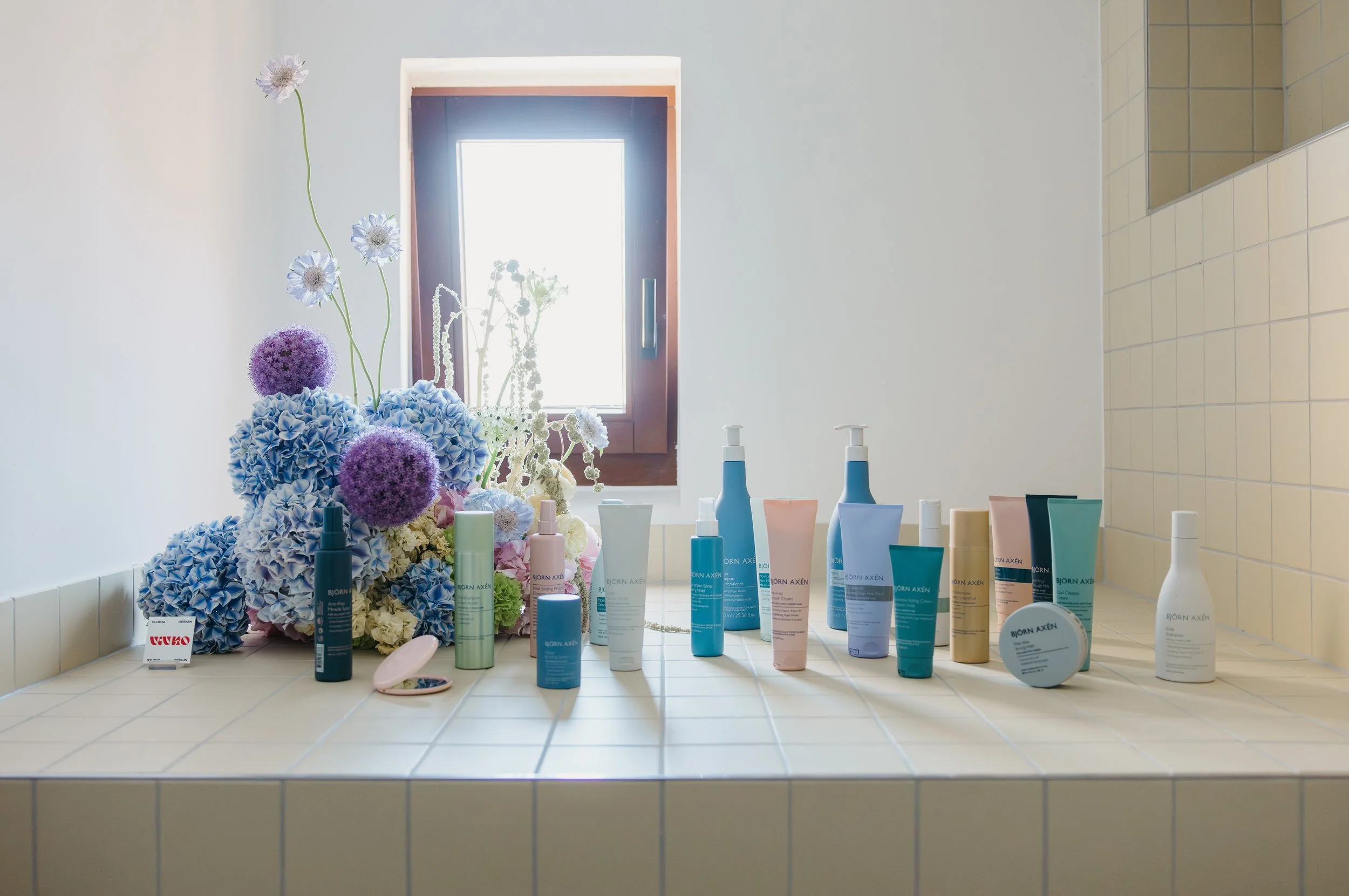 Sculptural floral arrangements created for the LYKO x BJÖRN AXÉN collaboration at Framework Kreuzberg. The designs brings together purple, pink, green and blue blooms that perfectly match the brand's product palette. Positioned to work seamlessly with the product display, the florals create a natural harmony between botanical elements and beauty products. The installations transforms the space into an engaging brand environment where the sculptural arrangements enhance the product presentation while maintaining cohesive color coordination throughout.